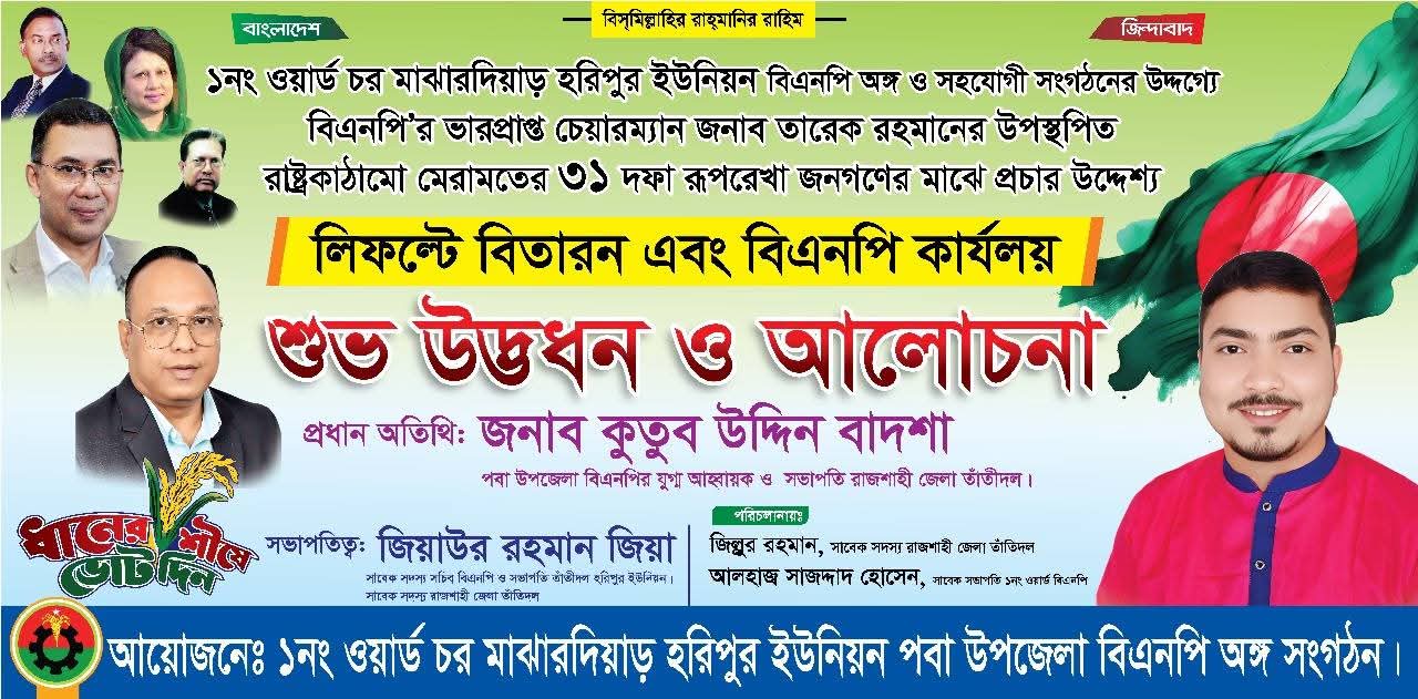 পবা উপজেলার মাঝাড় দিয়াড় চরে বিএনপির কার্যালয় উদ্বোধন, তারেক রহমানের ৩১ দফা রূপরেখা প্রচার