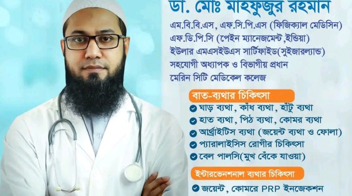 বাত-ব্যথা,কোমর ব্যথা, হাঁটু ব্যথা, ঘাড় ব্যথা, আর্থ্রাইটিস, মেরুদণ্ড-জয়েন্ট রোগ, স্ট্রোক ও প্যারালাইসিস ইত্যাদি রোগের সেবা দিচ্ছেন— 🩺ডাঃ মোঃ মাহফুজুর রহমান সহযোগী অধ্যাপক ও বিভাগীয় প্রধান (ফিজিক্যাল মেডিসিন বিভাগ, মেরিন সিটি