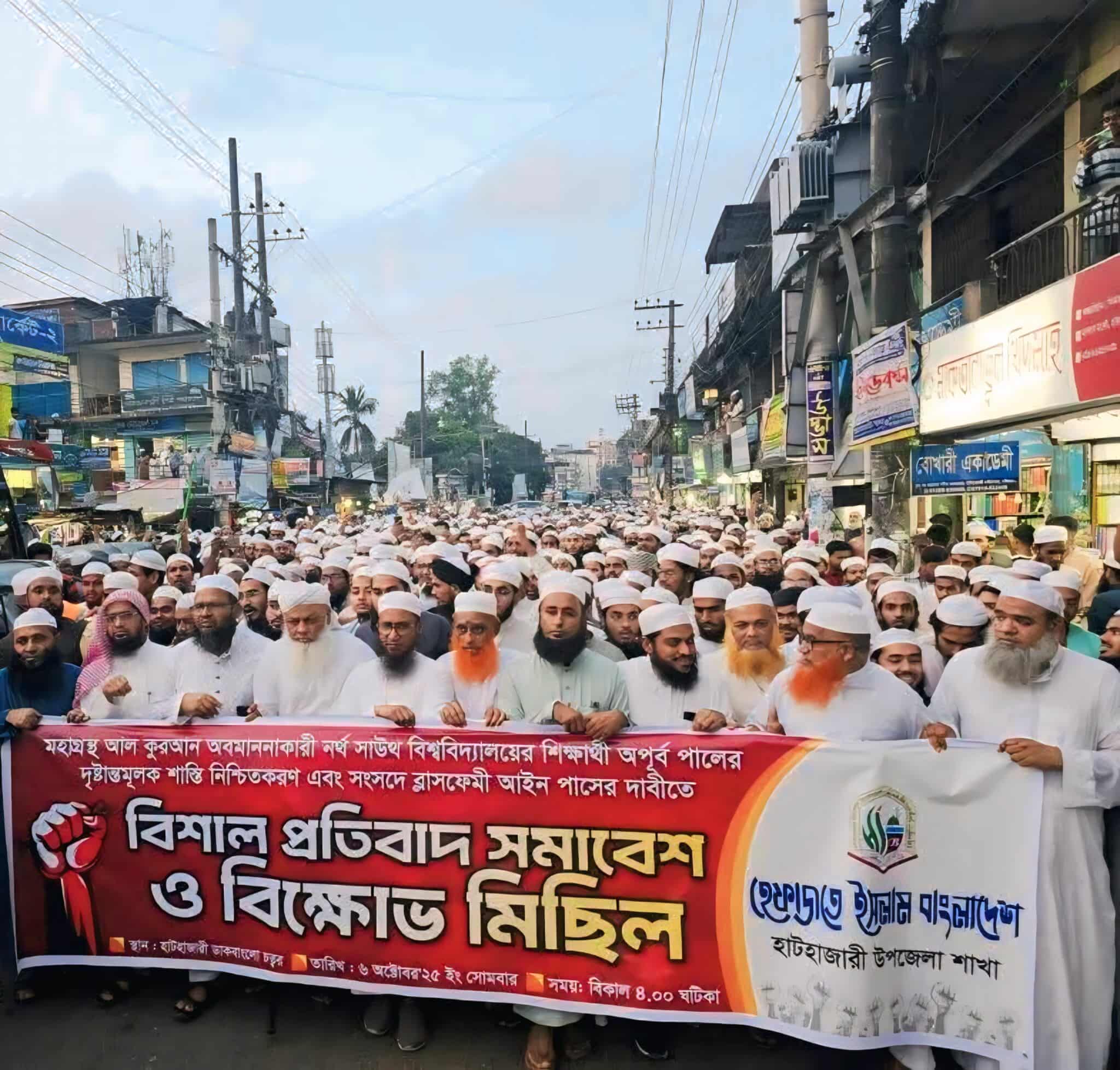 বিক্ষোভ মিছিল পূর্ববর্তী প্রতিবাদ সমাবেশে প্রধান অতিথির বক্তব্যে হেফাজতের কেন্দ্রীয় নায়েবে আমীর,হাটহাজারী মাদরাসার সিনিয়র মুফতী ও মুহাদ্দিস মুবাল্লিগে ইসলাম আল্লামা মুফতী জসিম উদ্দিন বলেন,নর্থসাউথ বিশ্ববিদ্যালয়ের শিক্ষার্থী অপূর্ব নামের এক কুলাঙ্গার কর্তৃক মহাগ্রন্থ আল-কোরআন অবমাননার জঘন্য দৃশ্য দেশের কোটি কোটি ধর্মপ্রাণ মুসলমানের হৃদয়ে গভীরভাবে আঘাত করে।যারা এমন করছে, তারা আদর্শিকভাবে পরাজিত হয়ে উসকানিমূলক এই কাজ করেছে।সরকারের উচিত এই ধরনের ঘটনার পেছনের ইন্ধনদাতাদের শনাক্ত করে আইনের আওতায় আনা।সরকার কোরআন অবমাননাকারী এই কুলাঙ্গারের দৃষ্টান্তমূলক বিচার নিশ্চিত না করলে আমরা দেশের শীর্ষ ওলামায়ে কেরামের সঙ্গে পরামর্শ করে ঢাকা অভিমুখে লং মার্চের ডাক দিতে বাধ্য হবো।
