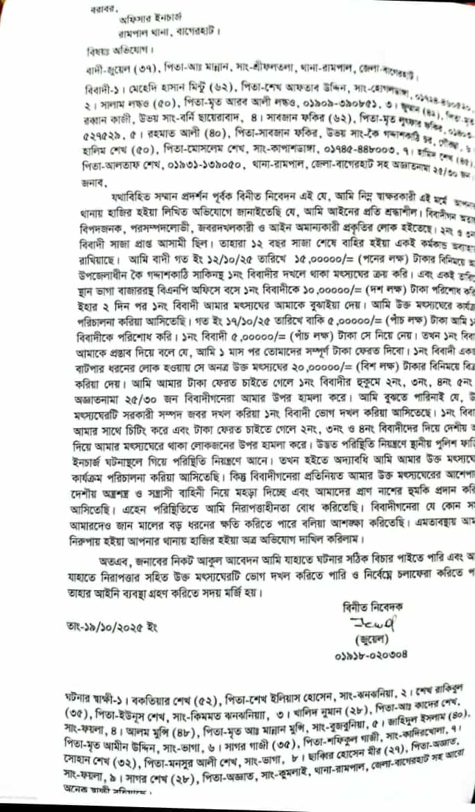 রামপালে মৎস্য ঘেরের বিরোধ নিয়ে হামলা থানায় অভিযোগ দায়ের