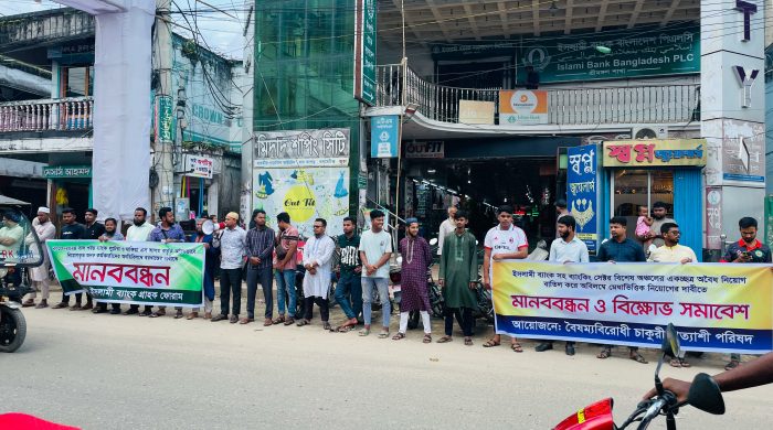 মোঃ জালাল উদ্দিন নিজস্ব প্রতিবেদক:- ইসলামী ব্যাংকসহ দেশের ব্যাংকিং খাতে অবৈধ নিয়োগ বাতিল ও মেধাভিত্তিক নিয়োগের দাবিতে মৌলভীবাজারের শ্রীমঙ্গলে মানববন্ধন ও বিক্ষোভ সমাবেশ অনুষ্ঠিত হয়েছে। সোমবার (৬ অক্টোবর ২০২৫) সকাল
