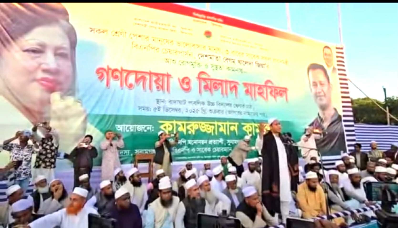 শুক্রবার বিকেলে সুনামগঞ্জের তাহিরপুর উপজেলার বাদাঘাট পাবলিক উচ্চ বিদ্যালয়ের খেলার মাঠে খালেদা জিয়ার সুস্থতা কামনায় এই খতমে কুরআন ও গণদোয়া মাহফিলের আয়োজন করা হয়।