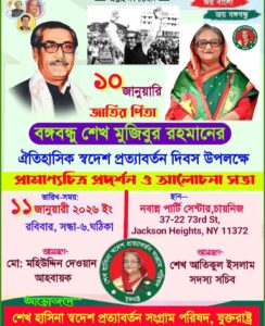 শেখ হাসিনা সংগ্রাম পরিষদ যুক্তরাষ্ট্র শাখার উদ্যোগে আজ রবিবার,১১ জানুয়ারি ২০২৬,সন্ধ্যা ৬টায় নিউইয়র্কের বাংগালি অধ্যশিষ জ্যাকসন হাইটসের নবান্ন রেস্টুরেন্টে স্বাধীনতার মহান স্থপতি জাতির পিতা বংগবন্ধু শেখ মুজিবুর রহমানের ১০ জানুয়ারি ১৯৭২ এ স্বদেশ প্রত্যাবর্তন দিবসের ৫৪তম বার্ষিকী উদযাপন অনুষ্ঠানের আয়োজন করেছে ।