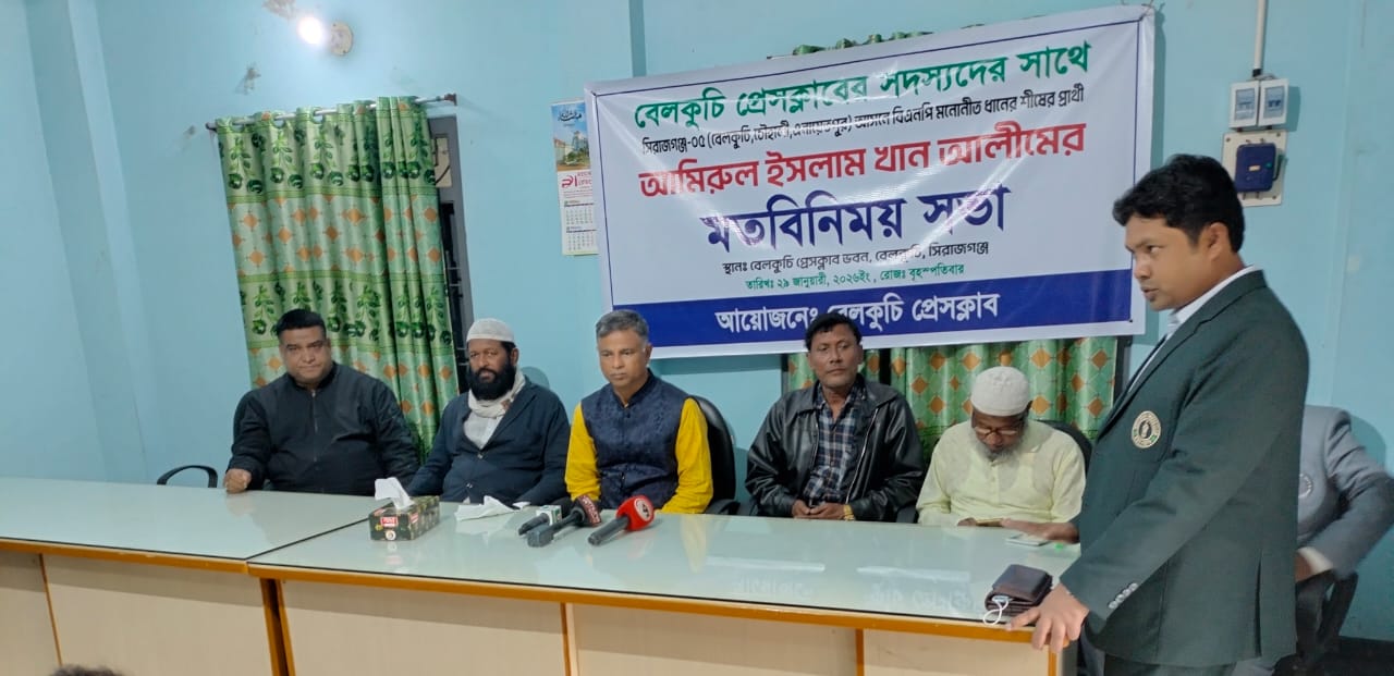 সিরাজগঞ্জ ৫ আসন( বেলকুচি ও চৌহালী উপজেলা) বিএনপি প্রার্থী আমিরুল ইসলাম খান আলিম, বেলকুচি প্রেসক্লাবের সাংবাদিকদের সাথে মতবিনিময় করেন। গত ২৯ জানুয়ারি ২০২৬ দুপুর ১২টায় প্রেসক্লাবে এ মতবিনিময় অনুষ্ঠানের আয়োজন করে সাংবাদিকেরা। এ সময় প্রেসক্লাবের সকল সাংবাদিক উপস্থিত ছিলেন। যমুনা নদীর তীর ঘেরা এ আসনে মহিলা ও পুরুষ ভোটারের সংখ্যা ৪ লাখ ২৬ হাজার। এ এলাকার মানুষের জীবন জিবীকা বেশ কষ্টের। নদী ভাঙ্গনের ফলে লাখো মানুষ পৈতৃক ভিটে ও আবাদি জমি হারিয়ে কষ্টে জীবন অতিবাহিত করতে বাধ্য হচ্ছে। অতিতে এ আসনটি বিএনপির ঘাটি হিসেবে চিহ্নিত হলেও দিনের ভোট রাতে হওয়ায় আসনটি আওয়ামী লীগ স্বৈরাচারী শাসক জবর দখলে নিত। বিগত ১৭ বছর উন্নয়নের কোন ছোঁয়া লাগেনি এখানে। চিকিৎসা সেবা,শিক্ষা ও সড়ক যোগাযোগের দিক থেকে অবহেলিত জনপদ হিসেবে পরিচিত বলে সাংবাদিক ও সুধি মহল মনে করছে। অনুষ্ঠানে সাংবাদিকদের বিভিন্ন প্রশ্ন ও এলাকায় উন্নয়নে আমিরুল ইসলাম খান আলিম এর ভবিষ্যৎ পরিকল্পনা জানতে চাওয়া হয়। আমিরুল ইসলাম খান সাংবাদিকদের জানান। আমি রাজনীতি মানে বুঝি জনকল্যাণ এবং প্রত্যেক রাজনৈতিক নেতা ও কর্মির উচিৎ ব্যক্তিস্বার্থ ভুলে নিজেকে জনগনের জন্য নিবেদিত করা। এ সময় তিনি সিরাজগঞ্জ ৫ আসনসহ দেশের সকল আসনে নির্বাচনে অংশ গ্রহন কারী দের প্রতিহিংসা ও স্বার্থপরতা ত্যাগ করে জনগনের আস্থা ও ভোটের অধিকার সমুন্নত করতে শান্তিপূর্ণ সহযোগিতা কামনা করেন। চৌহালী এনায়েত পুর ও বেলকুচির গন মানুষের সকল অসুবিধা ও প্রতিবন্ধকতা দূর করতে দৃঢ় প্রতিজ্ঞা করেন। বেলকুচির মানুষের চিকিৎসা সেবা বঞ্চিত দুর করতে বেলকুচি হাসপাতালকে ৫০ শয্যা হতে ২০০ শয্যা বিশিষ্ট হাসপাতাল এবং বেলকুচি সড়ক পথ সম্রসারিত করে জনযাট মুক্ত করার প্রয়জনীয় পদক্ষেপ পরিকল্পনা তুলে ধরেন।পাশাপাশি বেলকুচি যেহেতু একটি তাঁতশিল্পের সমৃদ্ধ অঞ্চল। বর্তমানে কালের বির্বতনে তাঁতশিল্প আধুনিকায়ন না হওয়ার প্রতিনিয়ত তাঁতশিল্প হমকির দিকে ধাবিত হচ্ছে বলে জানান। তাঁতশিল্পে আধুনিকায়ন প্রক্রিয়া এনে তাঁত মালিক ও শ্রমিকদের বেগবান করার অভূতপূর্ব পরিকল্পনা উপস্থাপন করেন।সর্বপরি তিনি এলাকার উন্নয়নে ৬০ বিঘা জমিতে একটি শিল্প নগরী পরিকল্পনা নকসা তুলে ধরেন। যেখানে ৪/৫ টি বৃহৎ গার্মেন্টস একটি ইংলিশ মিডিয়াম কিন্ডারগার্টেন স্কুল এবং ইসলামি ধর্মপ্রাণ মুসলমানদের জন্য একটি কালচারাল সেন্টার সহ আপামর জনগনের জন্য একটি পায়ে হাটা পথ নির্মান থাকবে। এছাড়াও সেখানে একটি কারিগরী ট্রেনিং সেন্টার নির্মান করে দক্ষ শ্রমিক উৎপাদন করার পরিকল্পনা নিশ্চিত করার ভবিষ্যৎ পরিকল্পনা তুলে ধরেন। পাশাপাশি চৌহালী উপজেলার নদী ভাঙ্গন রোধে একটি টেক