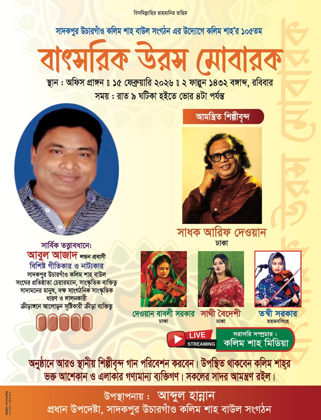 ব্রাহ্মণবাড়িয়ার সাদেকপুর উচারগাঁওয়ে আজ শনিবার ধর্মীয় ভাবগাম্ভীর্য ও আধ্যাত্মিক পরিবেশে অনুষ্ঠিত হতে যাচ্ছে পীর কলিম শাহ রহমতুল্লাহি আলাইহির ১০৫তম বার্ষিক উরস মোবারক। কলিম শাহ বাউল সংগঠন-এর উদ্যোগে আয়োজিত এ উরস মোবারকটি সংগঠনের নিজস্ব কার্যালয় প্রাঙ্গণে অনুষ্ঠিত হবে।