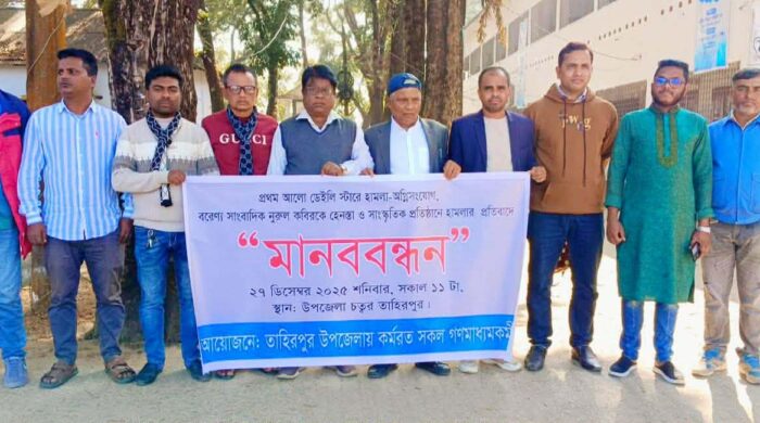 আমির হোসাইন/স্টাফ রিপোর্টার ডেইলি স্টার,প্রথম আলো অফিসে হামলার প্রতিবাদে সুনামগঞ্জের তাহিরপুরে সাংবাদিকদের মানববন্ধন অনুষ্ঠিত হয়েছে। শনিবার (২৭ ডিসেম্বর) দুপুরে সুনামগঞ্জের তাহিরপুর উপজেলা পরিষদের সামনে মানববন্ধন অনুষ্ঠিত হয়। প্রথম আলো ও