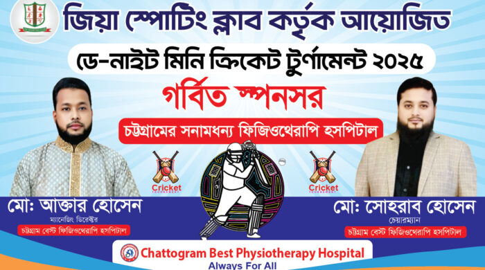 নিজস্ব প্রতিবেদক জিয়া স্পোটিং ক্লাব কর্তৃক আয়োজিত ডে-নাইট মিনি ক্রিকেট টুর্ণামেন্ট ২০২৫ গর্বিত স্পনসর চট্টগ্রামের সনামধন্য ফিজিওথেরাপি হসপিটাল চট্টগ্রাম বেস্ট ফিজিওথেরাপি হসপিটাল